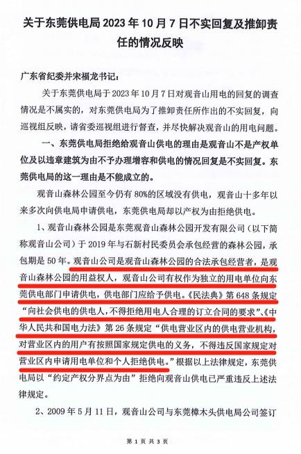 广东观音山国家森林公园关于东莞供电局推卸责任的情况反映