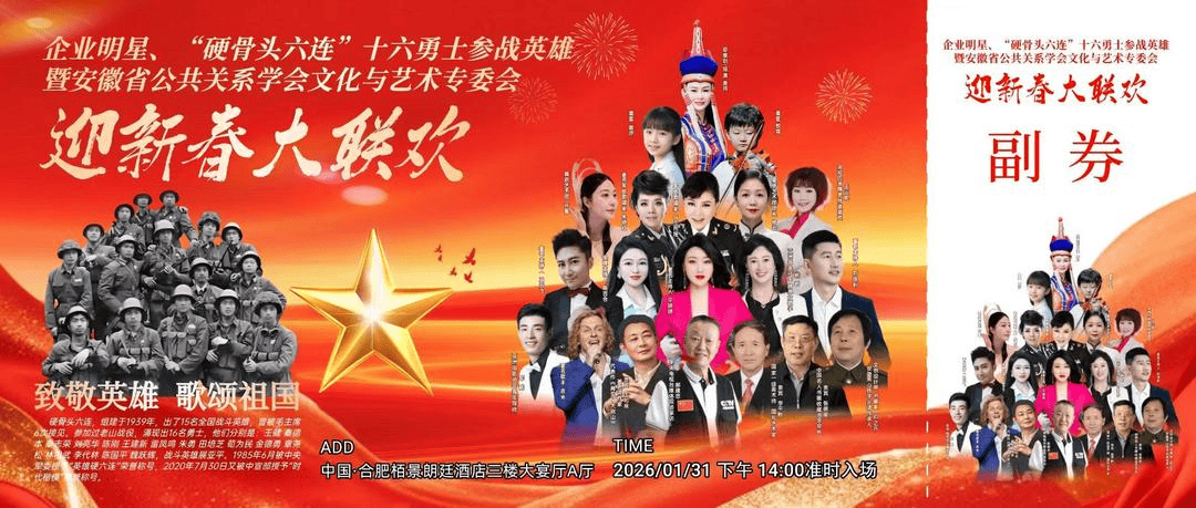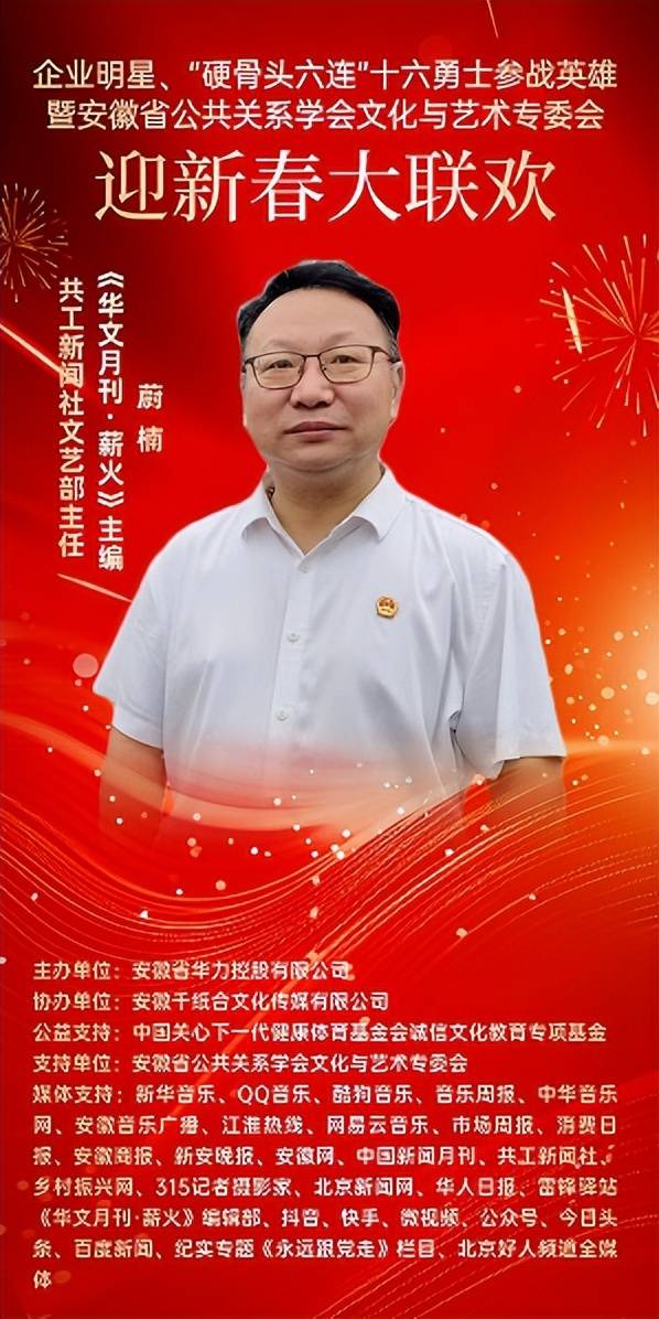 1月31日,由安徽省公共关系学会文化艺术专委会联合“企业明星”“硬骨头六连”“16参战英雄”代表共同举办的“迎新春大联欢”活动,将在合肥温情启幕。共工新闻社文艺部主任、《华文月刊》“薪火”特刊主编蔚楠应邀作为特邀嘉宾出席,与军旅英模、企业代表及文化界人士共聚一堂,共话文化传承、共叙家国情怀,为这场融合红色精神、企业活力与艺术魅力的新春盛会注入深厚的人文温度。