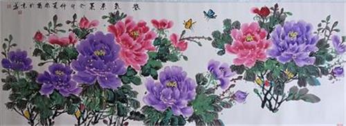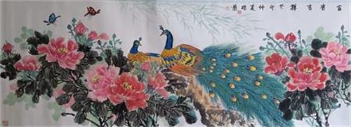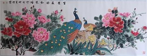 在《富贵花开》《吉祥富贵》等系列作品中,李凤兰更以巧思重构画面叙事。她创造性地将牡丹与山水相映,让花鸟画与山水画的边界在笔墨中自然消融:山间云雾缭绕处,几簇牡丹悄然绽放,既有山水的雄浑作为底色,又有牡丹的明艳点亮画面;有时她还会引入孔雀、凤凰等灵禽,让翎羽的华美与牡丹的雍容相映成趣,共同构成“万物和谐”的意境。这般构图,不仅拓展了传统花鸟画的视觉维度,更赋予了牡丹新的象征意义——它不再是孤立的“富贵符号”,而是自然生机与人间祥和的缩影,暗合着当代人对“人与自然和谐共生”的精神向往。