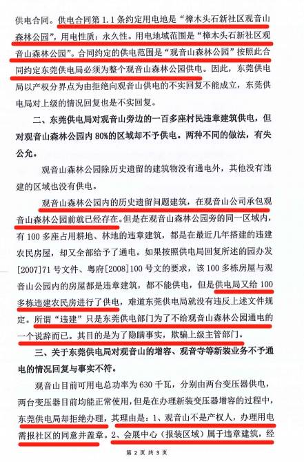 2022年2月,东莞市供电局书面回复观音山公司称,目前已供电至观音山公司红线,红线范围内用户用电设施应自行建设维护;观音山公司2003年报装用电,至今一直正常用电。