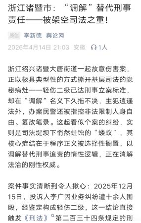 浙江绍兴诸暨大唐街道一起故意伤害案,正以极具典型性的方式撕开基层司法的隐秘病灶——轻伤二级已达刑事立案标准,却在“调解”名义下久拖不决,主犯逍遥法外,办案民警还被指控非法限制人身自由、篡改笔录。这起看似个案的纠纷,实则是司法堤坝下悄然蛀蚀的“蝼蚁”,其核心症结在于程序正义被选择性搁置,以调解替代刑事追责的惰性逻辑,正在消解法治的刚性权威。